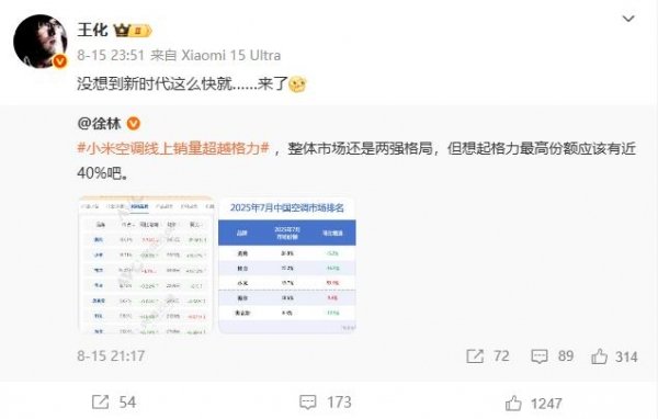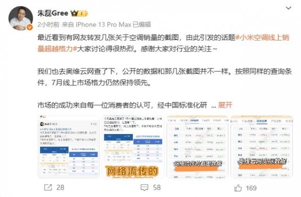 8月18日晚,格力电器市场总监朱磊在微博回应:“最近看到有网友转发几张关于空调销量的截图,由此引发的话题#小米空调线上销量超越格力#大家讨论得很热烈。感谢大家对行业的关注。我们也去奥维云网查了下,公开的数据和那几张截图并不一样。按照同样的查询条件,7月线上市场格力仍然保持领先。”