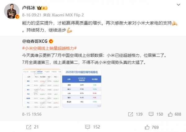 对此,小米集团合伙人、总裁,手机部总裁,小米品牌总经理@卢伟冰转发相关微博发文表示:“能力的坚实提升,才能赢得高质量的增长。再次感谢大家对小米大家电的支持。持续努力,继续进步。”