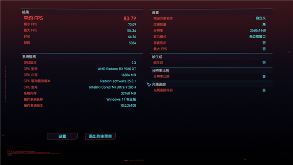 有了显卡坞,GTi15 Ultra 游戏的表现可以说是鸟枪换炮了。实测赛博朋克 2077,2K 高画质并 100% 渲染,平均帧就高达 83 帧,可以说毫无压力。
