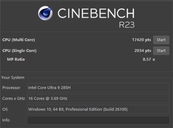 具体到跑分上,以衡量 CPU 性能的 Cinebench R23 为例,单核 2034,多核 17420。对比上一代 185H 提升了 10% 左右。