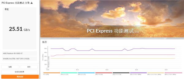 先是 3DMark PCIe 带宽测试。25.51 GB/s 说明几乎跑满了 5.0 x8 的带宽。这意味着 9060XT 可以完整发挥全部性能。