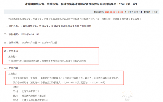 8月5日,项目结果更正,中标供应商由北明软件变更为利亚德光电股份有限公司,中标金额同步变更为3100901元。