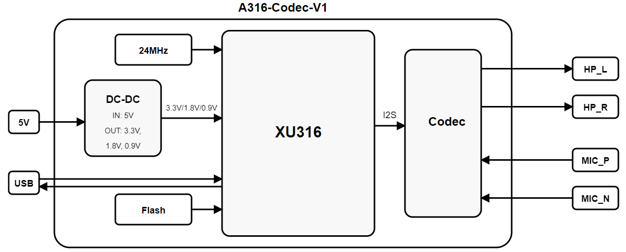A316-Codec-V1的系统架构主要包括XMOS XU316处理器、CODEC芯片、USB接口和相关外设。系统通过USB接口与主机连接,由XU316处理器控制CODEC芯片进行音频采集和处理,实现高质量的语音输入和输出功能。