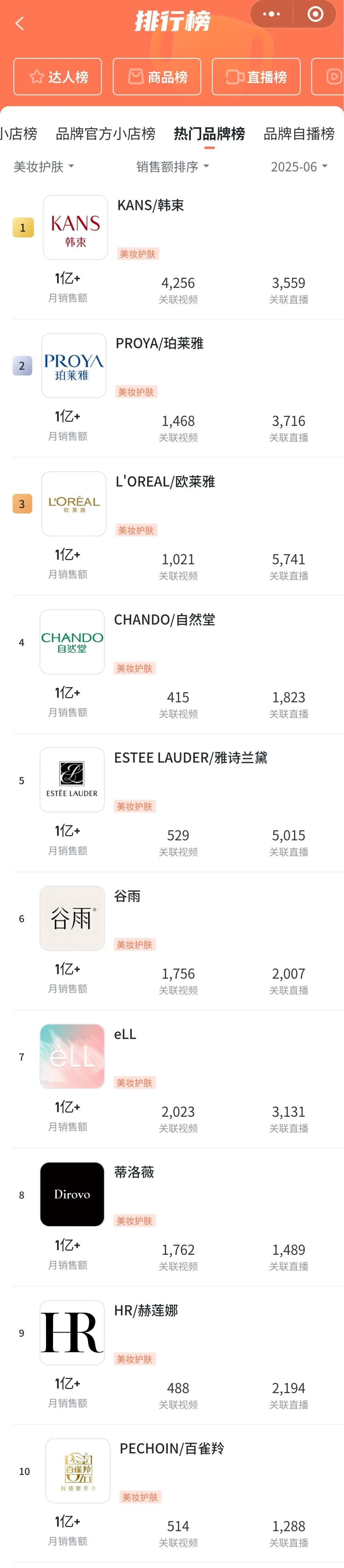 通过蝉妈妈先看看6月份的抖音美妆护肤热门品牌榜TOP10。