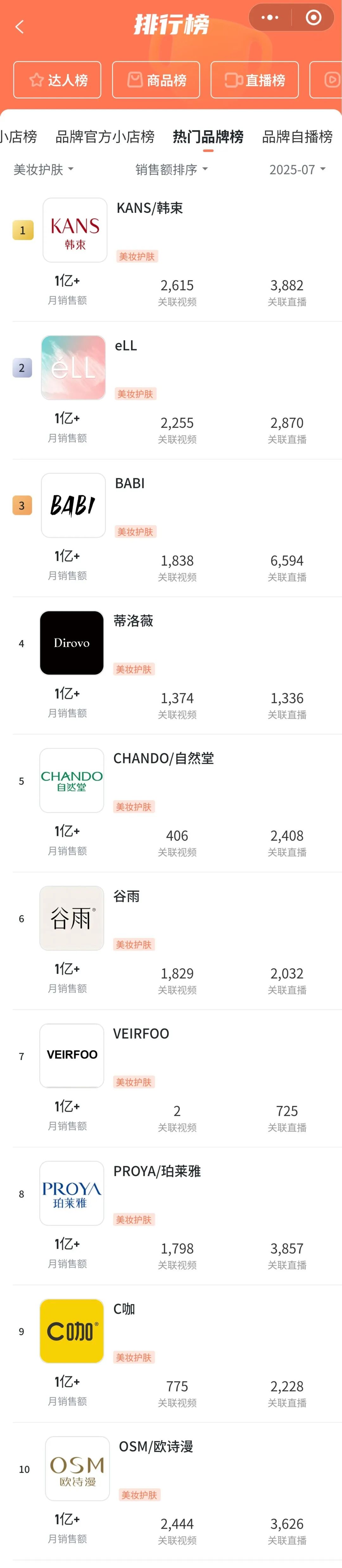 再来看看7月份的美妆护肤TOP10。