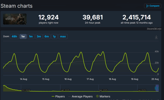 根据Steam平台的数据显示,目前游戏的在线玩家人数仍有12924人,过去24小时的最高人数更达到了惊人的39681人,足以证明其卓越的游戏品质。