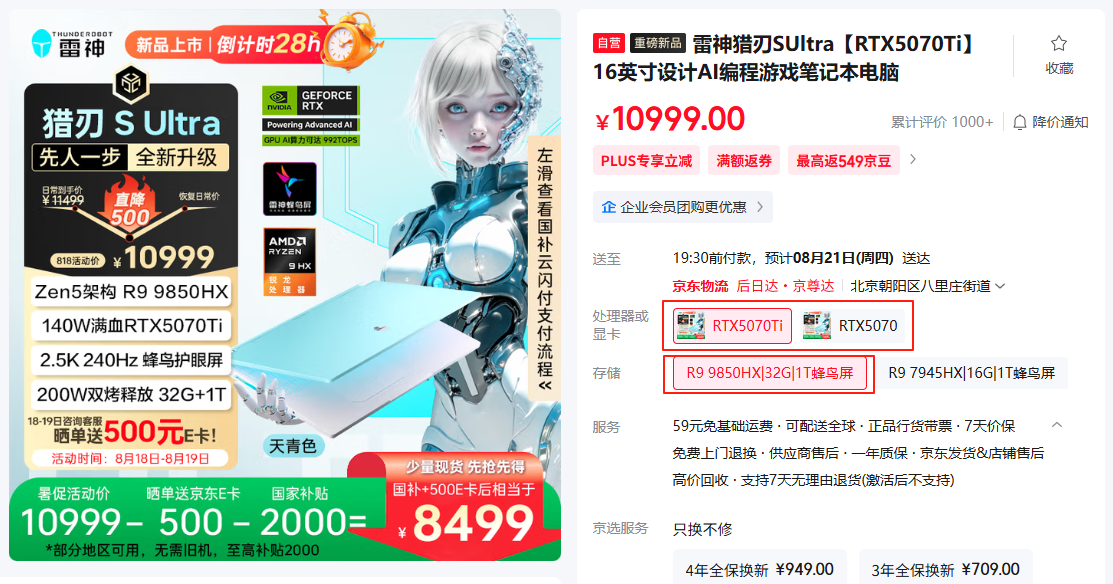 雷神猎刃Ultra也有两款机型参与活动。它们分别搭载了锐龙9 9850HX处理器,同样是采用创新的Zen 5架构,领先的4nm工艺,拥有12颗超大核心24线程,高速缓存76MB,最高加速频率5.2GHz,独立显卡则分为115W的RTX 5070和140W的RTX 5070Ti Laptop。根据显卡配置的不同,双烤性能分为180W和200W,足够流畅体验各种电竞网游和大型3A。天青色的机身设计,颜值,性能、性价比和优质便捷的售后服务都是其突出卖点。