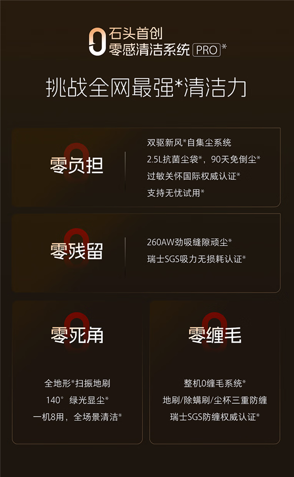 同时,石头H50 Pro具有260AW飓风吸力,深层垃圾席卷而出,高效清洁。采用九锥气旋尘气分离通过SGS吸力无损认证。整机具有8重过滤,锁住小至0.1μm过敏原,深度清除三大类过敏原,获得过敏关怀国际权威认证。