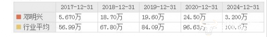 而邓明兴此前披露的年薪均不超过30万,2018年为18.70万,2019年为19.60万,峰值是2020年达到了24.50万。2024年因任期不满一年,薪酬为3.2万。