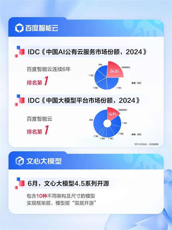 智能云业务在本季度实现了健康增长。根据IDC《中国AI公有云服务市场份额,2024》报告,百度智能云已连续6年排名第1;IDC《中国大模型平台市场份额,2024》报告中,百度智能云再次登顶,位居第一。