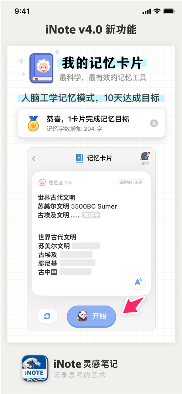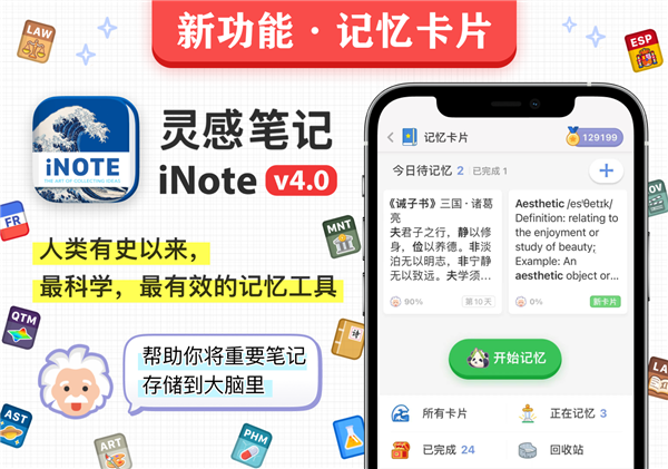 4.0版本正式发布全新“记忆卡片”功能,耗时3年研发,通过符合人脑工学的记忆强化模式,帮助你更高效记住笔记内容和知识要点。