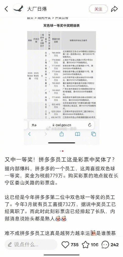 据多方信源透露,本次中奖者极有可能是拼多多员工。