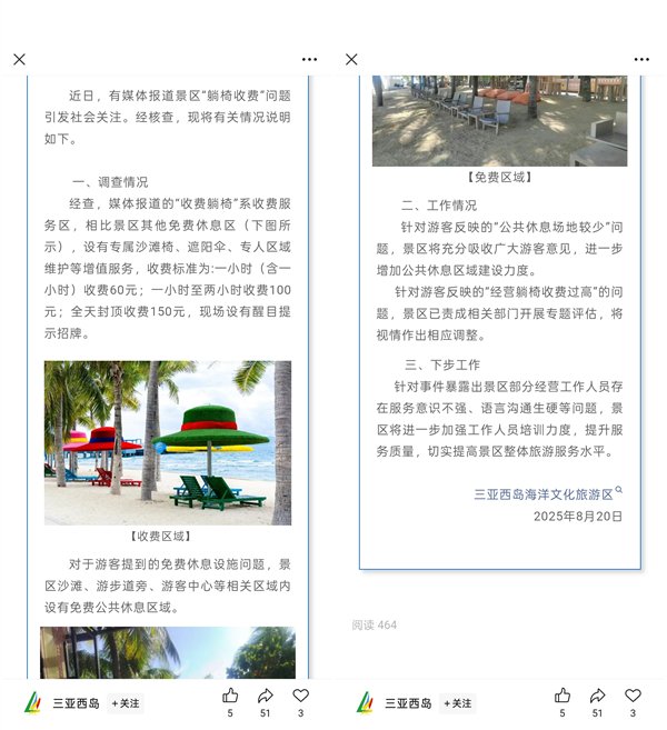 对此,三亚西岛通过微信公众号发布情况说明,媒体报道的“收费躺椅”系收费服务区,相比景区其他免费休息区设有专属沙滩椅、遮阳伞、专人区域维护等增值服务,收费标准为一小时(含一小时)收费60元;一小时至两小时收费100元;全天封顶收费150元,现场设有醒目提示招牌。