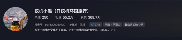 8月20日消息,据媒体报道,27岁河南小伙开挖机游历全国的经历走红网络,其抖音账号名为“挖机小温(开挖机环国旅行)”,目前已经积累了55.2万粉丝,获赞369.7万。
