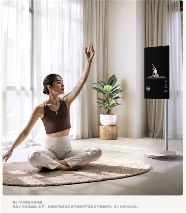 该设备还内置AI健身功能,借助视觉识别技术可实时纠正动作;在朋友聚会时,它还能秒变大屏点歌台,MV歌词同步显示,并支持连接MIJIA K歌麦克风。