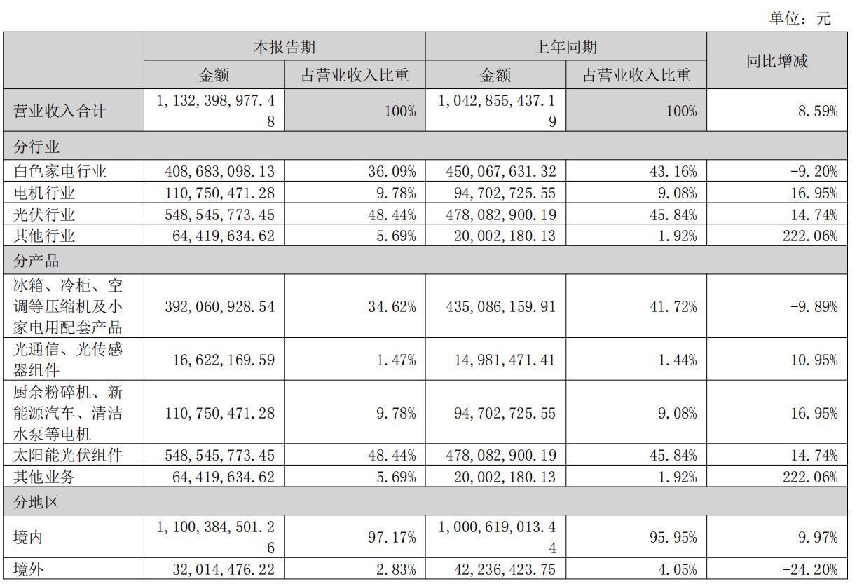 分行业看,上半年,星帅尔电机业务实现营收1.11亿元,占营收比重9.78%,同比增长16.95%,增速位列各项业务第一。