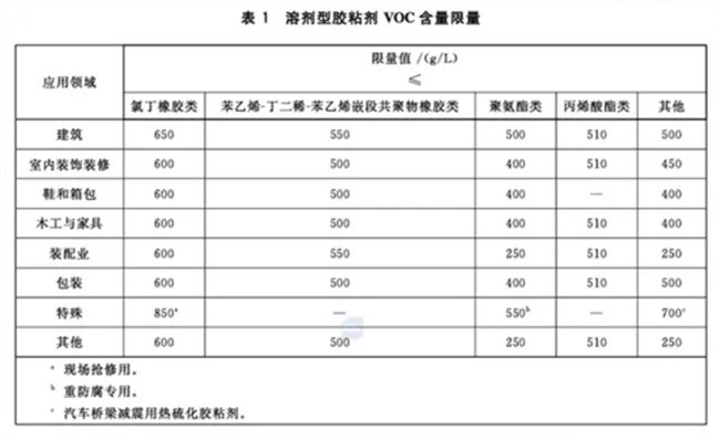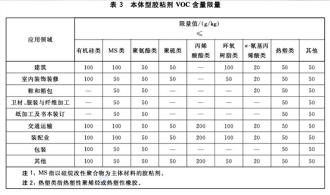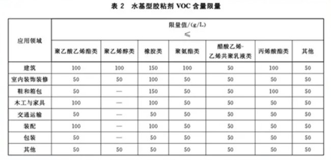 在该标准中,根据胶粘剂产品中不同的分散介质和含量,将胶粘剂分为溶剂型、水基型、本体型共三类,通常水基型胶粘剂、本体型胶粘剂为低VOC(挥发性有机化合物)型胶粘剂。GB 33372——2020《胶粘剂挥发性有机化合物限量》中对三类胶粘剂的VOC含量限量要求如下: