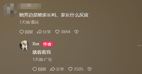 还有人询问小孩旁边是她家长吗,家长什么反应,网友回复:“就看着我。”