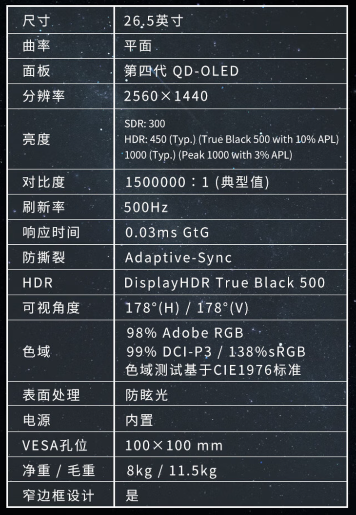 MPG 271QR QD-OLED X50采用了26.5英寸的三星第四代QD-OLED面板,10bit色深,可视角度为178度(水平和垂直),分辨率为2560 x 1440,刷新率为500Hz,响应时间(GtG)为0.03ms,得到了VES ClearMR 21000和DisplayHDR True Black 500认证。该款显示器保证了行业领先的动态清晰度和生动对比度,即使在激烈的游戏中也能呈现逼真的视觉效果。