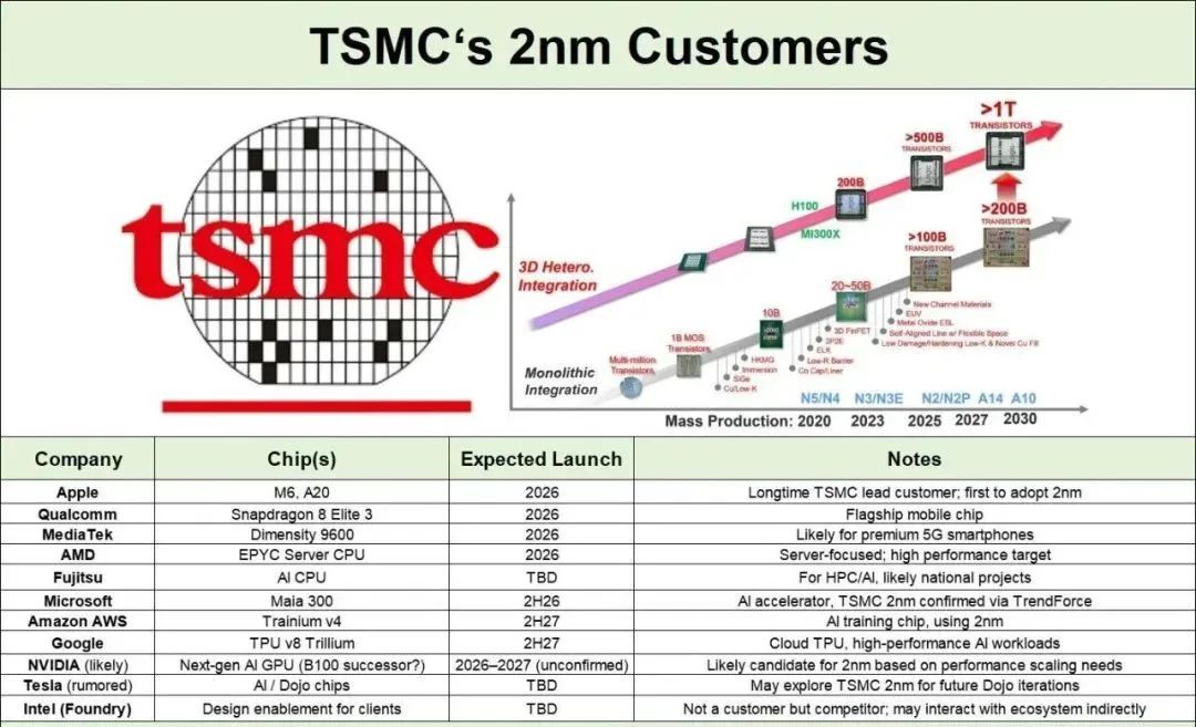 从3nm节点的初期投产经验看,良率爬坡是一大挑战。但凭借3nm节点200万片晶圆的量产经验,将2nm工艺开发周期压缩至18个月,良率仅用9个月便从30%提升至60%,预计年底将具备每月5万至8万片晶圆的投片能力。此外,台积电收到的2nm工艺流片(芯片设计验证阶段)数量是5nm工艺的四倍,显示出市场对2nm工艺的强烈需求。台积电N2的商用化将全球芯片设计企业推向新一轮“竞速赛”,AMD、英伟达、联发科、高通和苹果等关键客户均已锁定2nm产能。