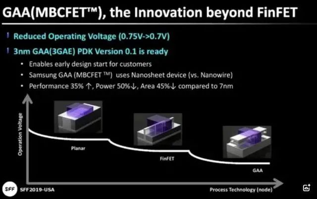 自芯片代工行业进入先进制程后,该架构也开始逐渐失效,2nm的节点就被普遍认为是“决战节点” —— 全环绕栅极(GAA)纳米片晶体管被提出。与FinFET相比,GAA架构相当于将栅极的鳍片旋转90°,然后再在垂直方向上分成了多条鳍片,来增加其与沟道的接触面积。2nm制程标志着台积电首次引入GAA晶体管架构,即纳米片(nanosheet)技术,取代此前长期主导的FinFET晶体管。