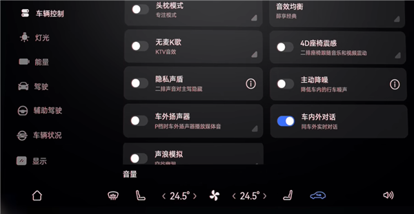 硬件方面包括车外6个拾音麦克风和1个扬声器,默认为关闭状态,需要的时候可以通过中控屏点击“车内外对话”打开。
