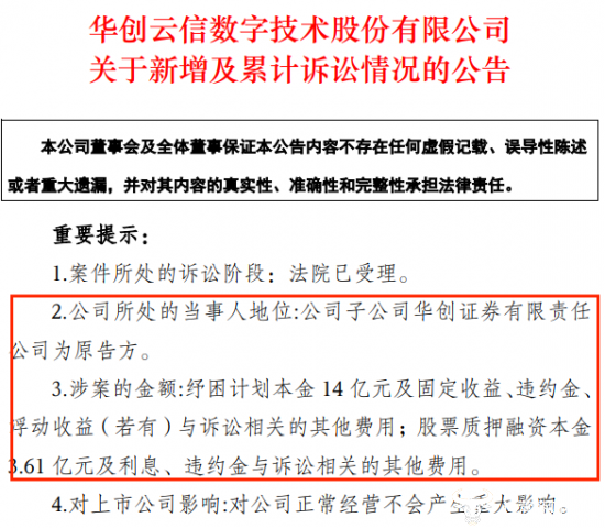 上述两期纾困计划分别于2022 年7 月、2024 年3月到期,股票质押于 2024 年 8 月到期。华创证券提起诉讼,请求判令姜伟等偿还纾困计划本金 14 亿元和股票质押融资本金 3.61 亿元,合计17.61亿元,并支付上述二者的固定收益、违约金、浮动收益(若有)及与诉讼相关的其他费用。