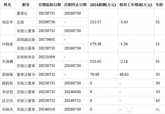 董事长胡忠华的薪资最高,为212.57万元,相对于2023年减少3.43万元。涨薪幅度最大的是董事会秘书葛婧瑜,相较于2023年,她涨薪40.62万元,2024年的薪酬为70.48万元。