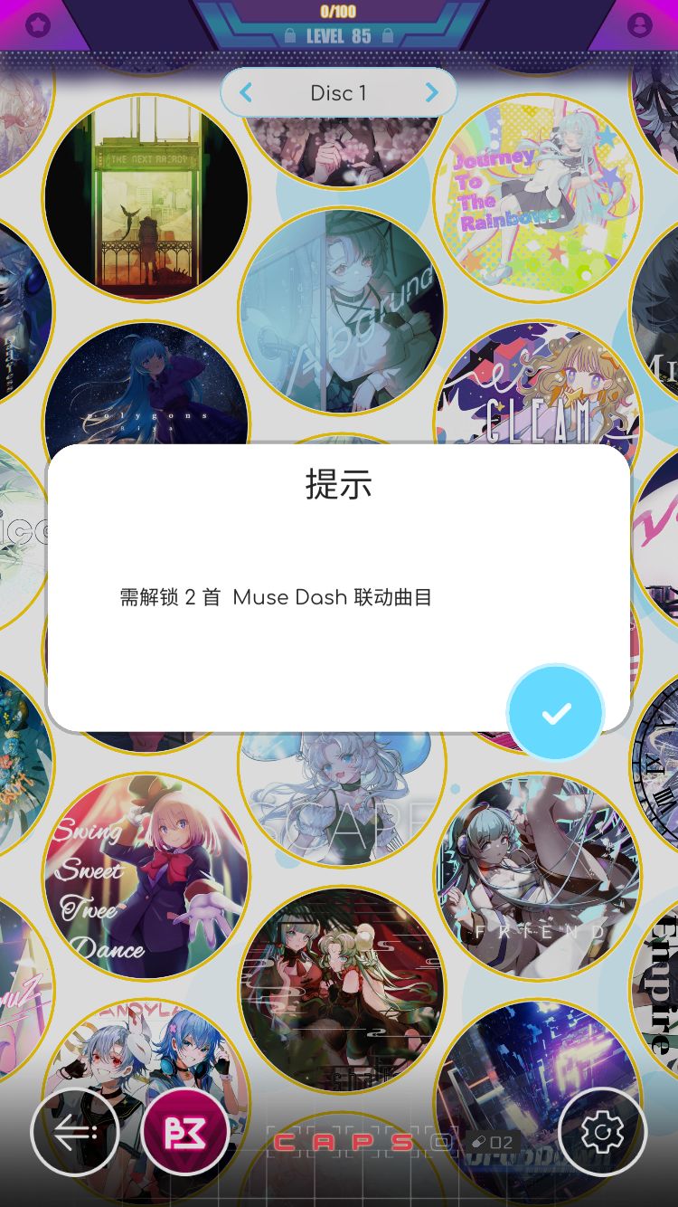 当角色等级达到85级时(四所示),系统会提示解锁两首喵斯快跑的联动歌曲,分别是天灵灵地灵灵、DOMINATOR和Comet Coaster;如果未完成解锁,后续游玩将无法继续获得经验值。