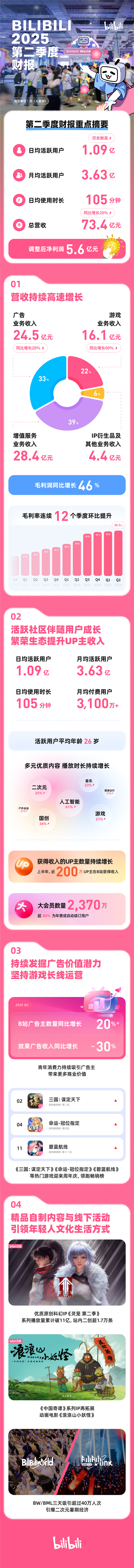 本季度,增值服务业务收入得到进一步提升,达28.4亿,同比增长11%。凭借精细化运营、丰富的内容供给与产品功能优化,直播业务稳健增长,毛利率持续提升。截至二季度末,B站大会员数量达2,370万,其中超80%为年度订阅或自动续费用户。