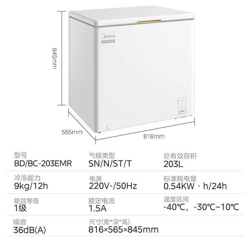 美的冰柜203升大容量节能省电