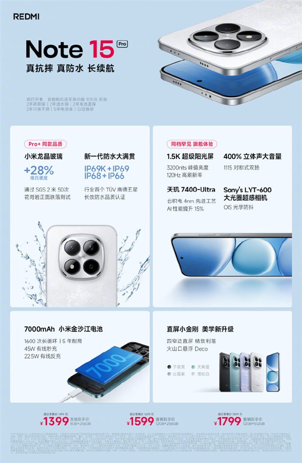 Note 15 Pro看齐Pro+同款品质,包括耐摔、防水、长续航、大音量等。