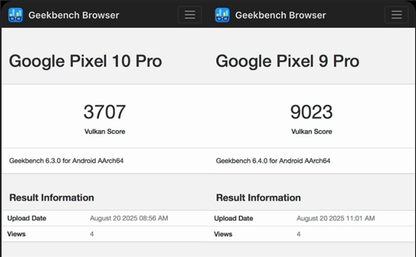 网上已经有跑分数据出来了,首先是GPU性能,Pixel 10 Pro的Geekbench Vulkan测试只有3707分,不仅没法跟iPhone 16 Pro的3.3万分、S25+的2.6万分相比,跟自家上代产品的9023分也没法比,简直开倒车。