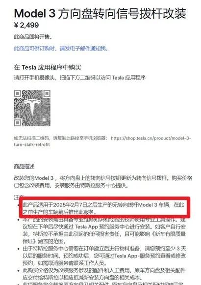 但紧接着,我司这位特斯拉车主的优越感就被这行小字打回现实:“ 仅适用于 25 年 2 月后生产的无转向拨杆 Model 3”。