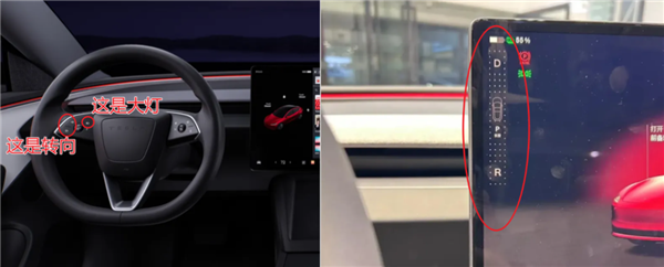 23、24 年的焕新版 Model 3 取消了转向和换挡拨杆,改为方向盘触摸转向和屏幕换挡。