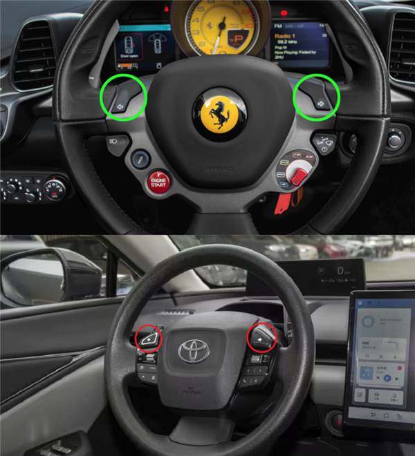 上到法拉利 458,下到丰田的这个 bz5 “验证码”车,都没有转向拨杆而是按键转向。