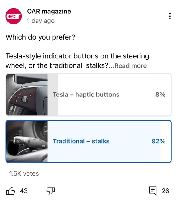 首先是前阵子,英国的老牌汽车媒体 Car Magazine 也在 X 上搞过一个投票,近 1600 个投票中,转向拨杆以压倒性优势获得青睐。