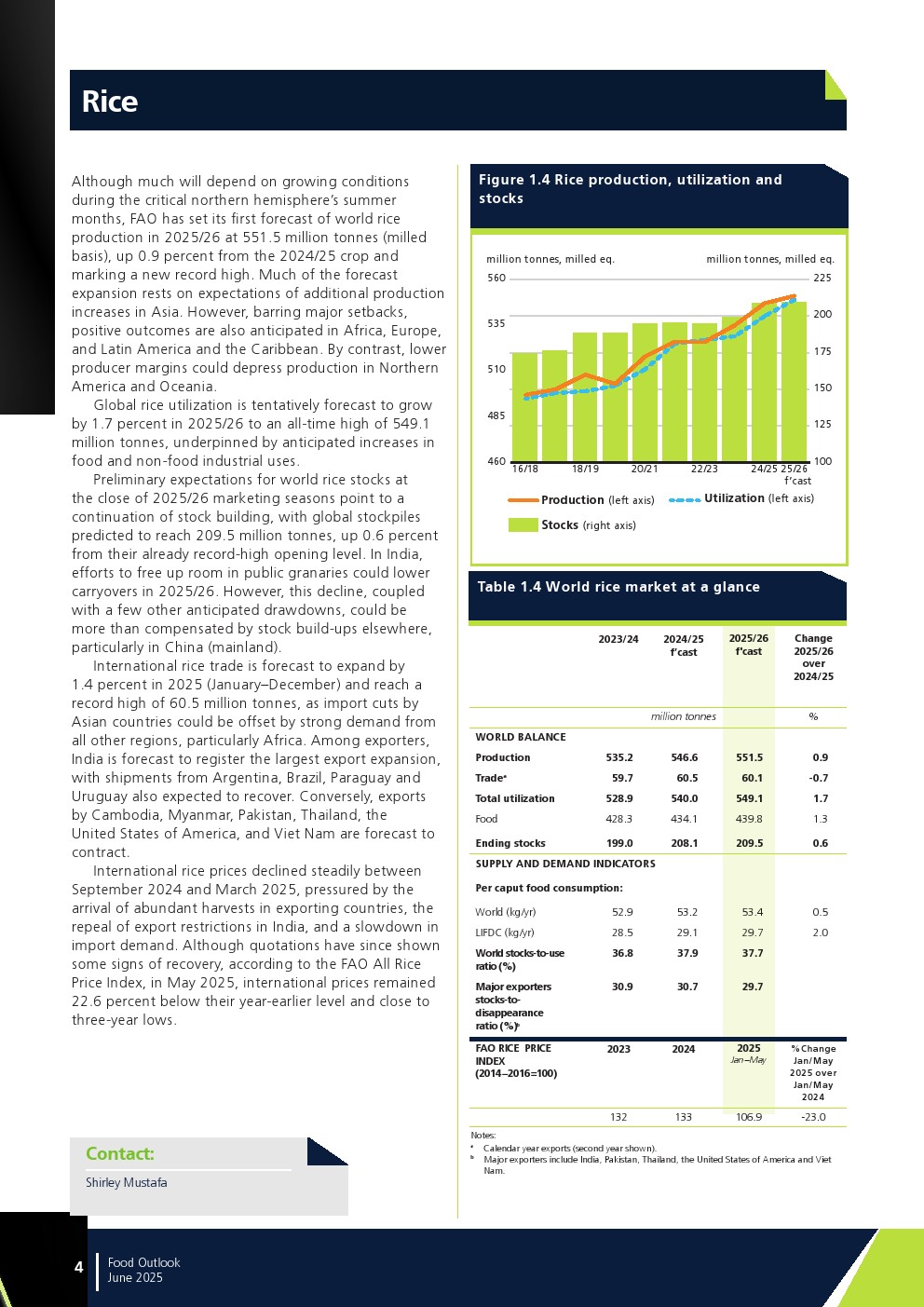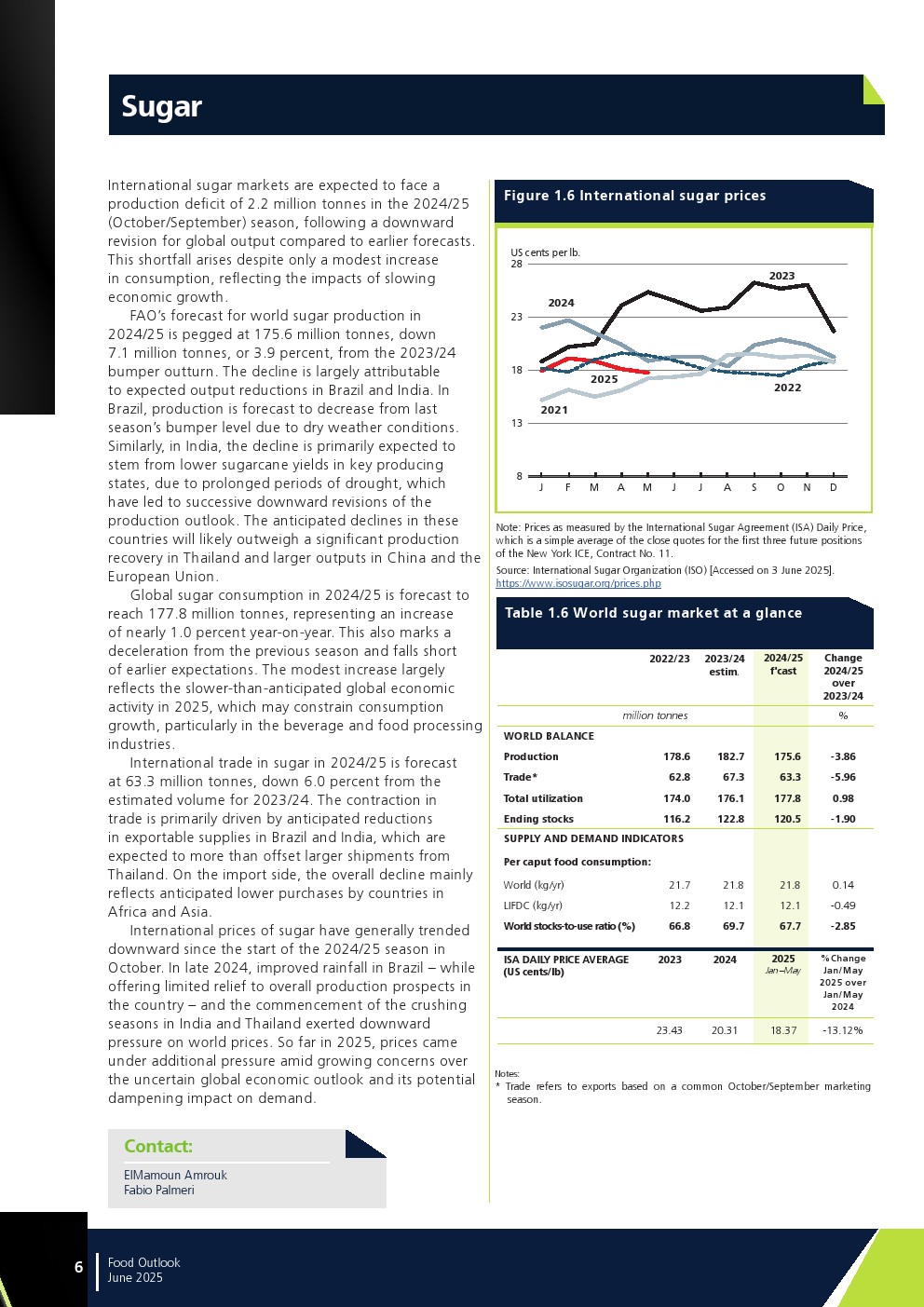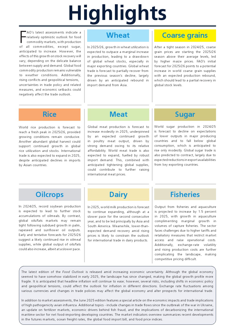 联合国粮农组织发布了“2025年年中食品展望报告”。最新评估显示,除糖类外,所有食品商品市场生产前景相对乐观,预计都将增产。但这一增长对库存恢复的影响将因供需间的微妙平衡而各异。全球食品商品生产仍易受天气条件影响。此外,冲突与地缘政治紧张局势升级、贸易政策及相关措施的不确定性、以及经济挫折都可能对贸易前景产生负面影响。