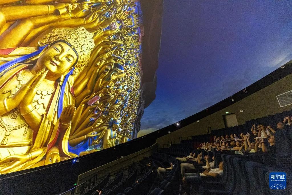 游客在重庆大足石刻景区观看8K数字球幕影片《大足石刻》。新华社记者 黄伟 摄