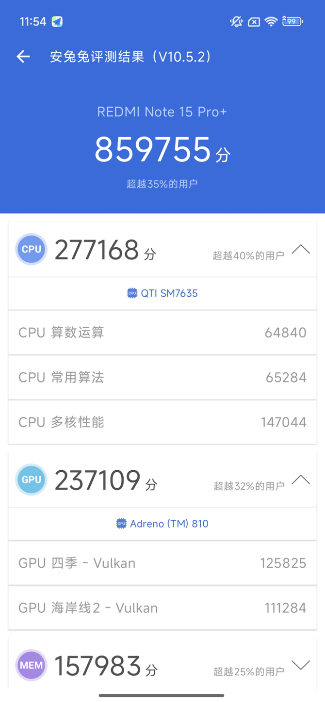 室温下的安兔兔跑分为85W9,定位中端,成绩也算中规中矩,和高通的骁龙8系列的平台还是差距较为明显,但是这个性能是足够应对日常绝大部分的体验的。