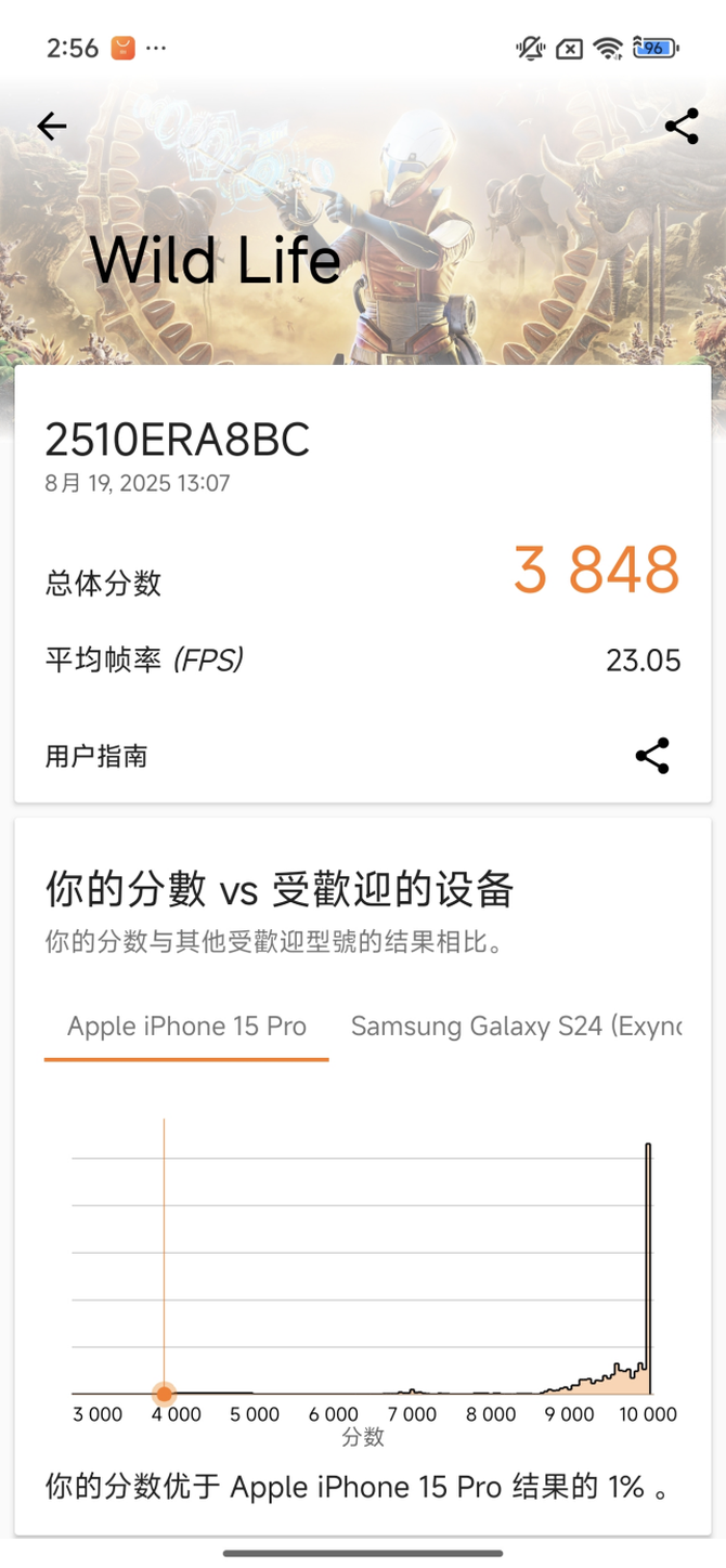 3DMARK的WildLife的综合得分为3848,居然领先了苹果的15 Pro,这个性能的话,应对绝大部分的游戏是完全没有任何问题的。
