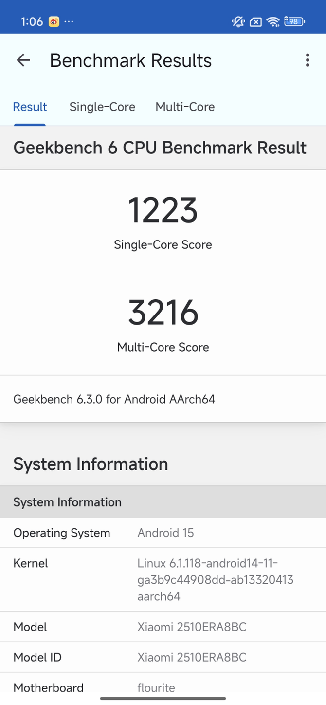 GeekBench 6的单核心综合得分为1223,多核心得分为3216。