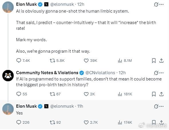 一位网友评论称:“如果AI被编程为支持家庭,这是否意味着它可能成为历史上最大的支持生育的技术?”马斯克回应称:“是的。”