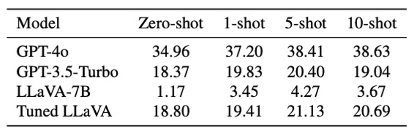 表 3 小样本上下文学习实验结果。展示四个模型(GPT-4o、GPT-3.5-Turbo、LLaVA-7B 及微调后的 LLaVA)在不同 shot 数(0-shot、1-shot、5-shot、10-shot)下的准确率变化。shot 数表示在模型回答问题前,输入上下文中提供的示例个数。