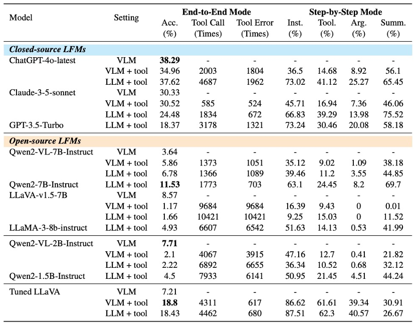 图 3 ToolVQA 统计数据在实验评估中,ToolVQA 涵盖三种模型设定(VLM、VLM+tool、LLM+tool)与两种评估模式(端到端解答与逐步执行),系统测试了包括 GPT-4o、GPT-3.5、Claude-3.5、Qwen2、LLaVA 在内的主流大模型,以及在 ToolVQA 训练集上微调的 LLaVA-7B 模型。性能表现总结如下: