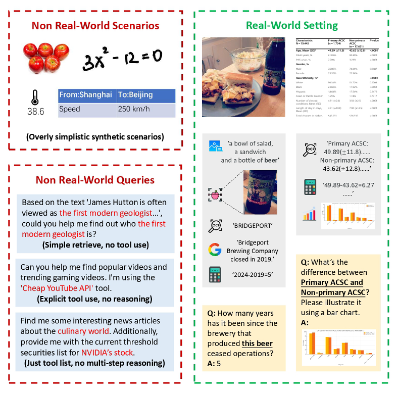 一是图像场景大多为合成内容,缺乏真实世界背景的复杂性与不确定性;二是任务设计趋于模板化,问题过于简单,或直接在指令中提示要使用哪种工具,难以覆盖真实人类问题的隐式推理特性,进而限制了模型在实际应用中的迁移能力与评估效果。