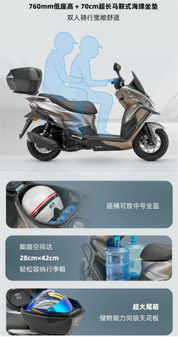 平脚踏区域空间较大,可放20寸行李箱或一件水,且出厂自带大容量尾箱,搭载单缸风冷PCR发动机,实际排气量为149.3cc,最大功率9kW,峰值扭矩12.2N·m。