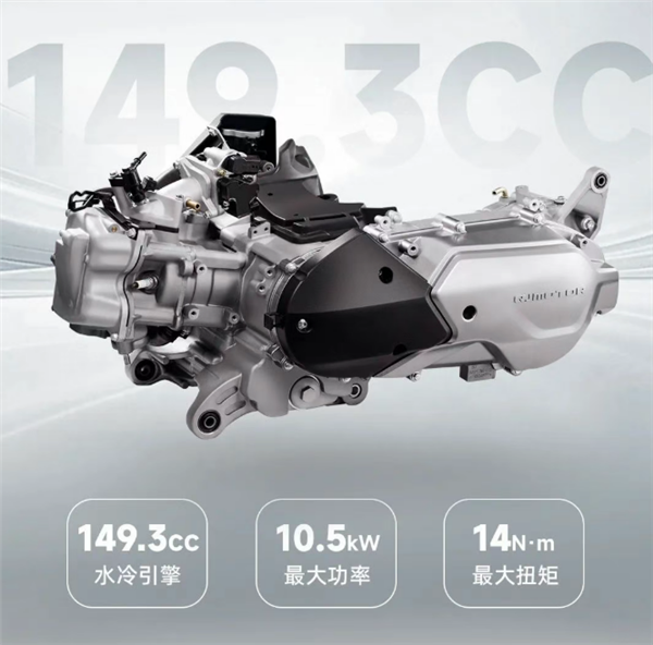 配备单缸水冷2气门SOHC发动机,实际排量149.3cc,最大功率10.5kW,峰值扭矩14N·m。