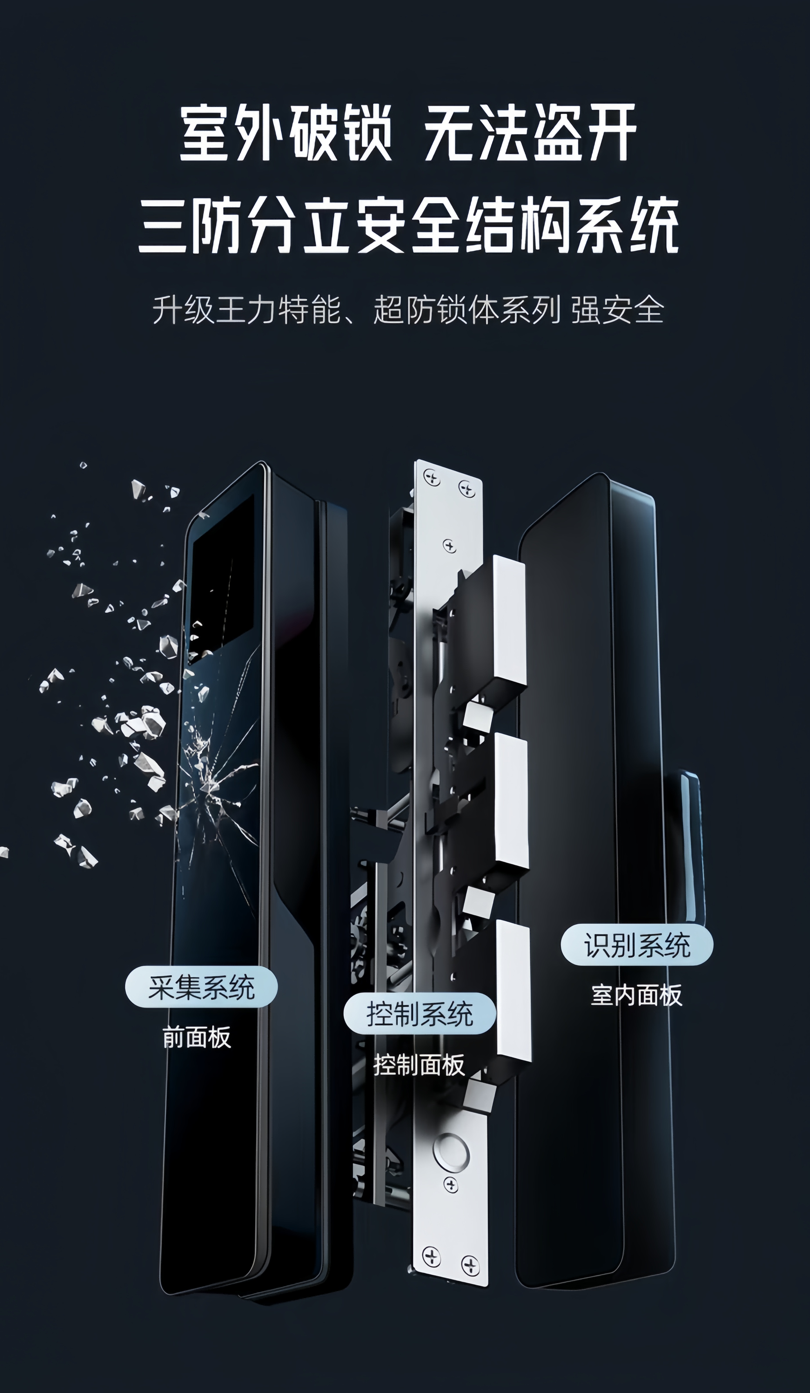 此外,王力独创的三防分立技术通过将识别、采集和控制三大核心模块物理隔离,即使前面板遭受暴力破坏仍能有效阻断非法开启路径,实现“破拆不破防”的极致安全防护。此外,再结合智能猫眼实时监控系统打造的可视化智能防线,为家庭安全树立坚不可摧的科技屏障。