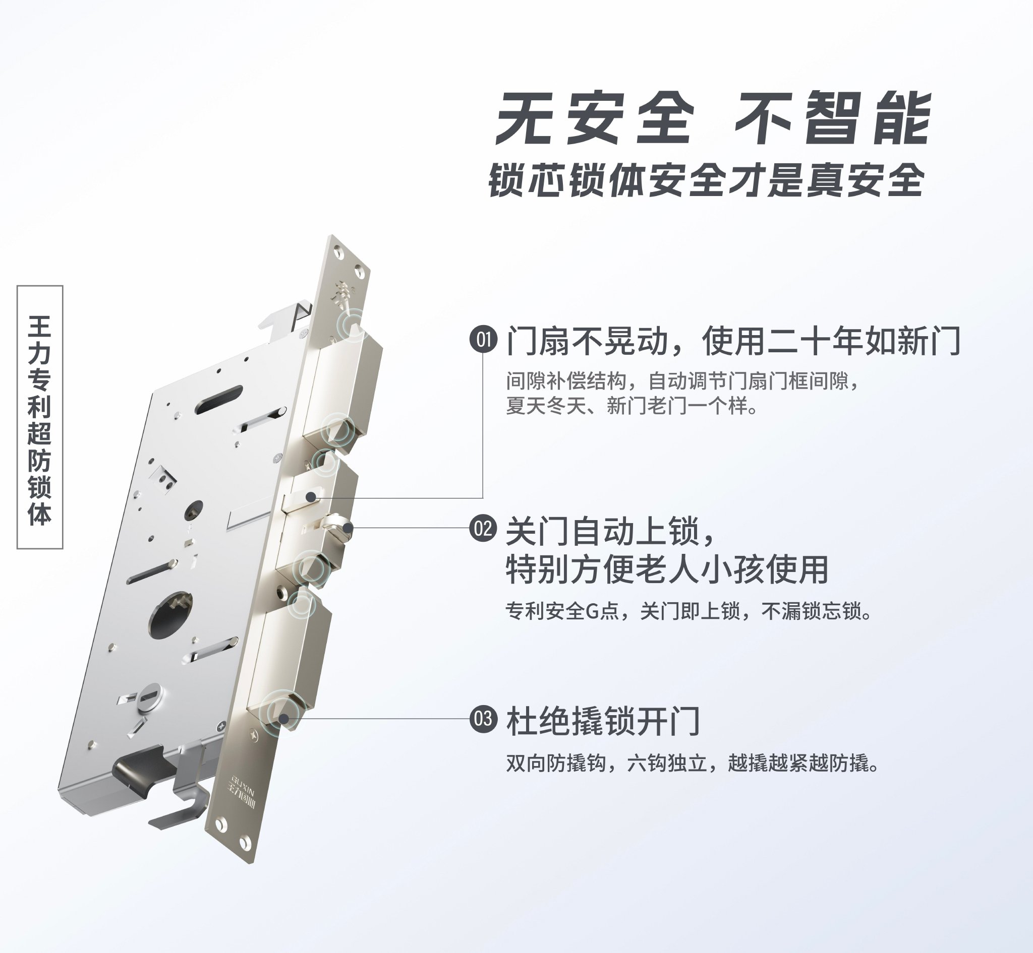 在锁体方面,王力的超防锁体通过集成专利安全G点、六重专利防撬钩及自动间隙补偿系统,实现了“关门即自动上锁”的便捷操作,彻底杜绝了忘锁、漏锁带来的安全隐患。其“越撬越紧”的主动防御机制与“使用20年不变形”的耐用性稳定性,为现代家庭构筑起“不怕忘、撬不开、用不坏”的立体安防屏障。